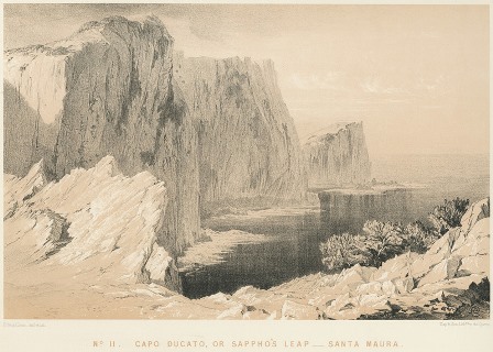 Ο Λευκάτας (Κάβο Δουκάτο) ή ακρωτήριο της Σαπφούς, Λευκάδα. Σε αυτό το ακρωτήριο είναι αφιερωμένο το τρίτο ποίημα από την πρωτόλεια συλλογή Στιχουργήματα, αλλά και μια προηγούμενη ανέκδοτη μορφή του, σε καθαρεύουσα, με τίτλο «Ύμνος εις την Λευκάταν». Από την έκδοση Lear, Edward. Views in the Seven Ionian Islands. A facsimile of the original edition published in 1863 by the Artist. Oldham: Hugh Broadbent. Πηγή: Travelogues. Με το βλέμμα των περιηγητών.