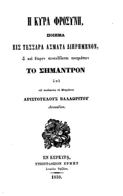 Το εσώφυλλο της πρώτης έκδοσης το 1859: Η κυρά Φροσύνη. Το σήμαντρον. Κέρκυρα: τυπ. Ερμής Αντ. Τερζάκη.