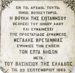 Αναμνηστική πλάκα στην είσοδο του Ιονίου Κοινοβουλίου, για την Ένωση των Ιονίων Νήσων με το Ελληνικό κράτος.