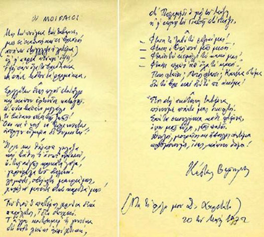 Χειρόγραφο του ποιήματος «Οι μοιραίοι». Προδημοσιεύεται στο περιοδ. Μαύρος Γάτος το 1922 [πηγή: Αρχείο Συγγραφέων ΕΚΕΒΙ / ΕΛΙΑ]