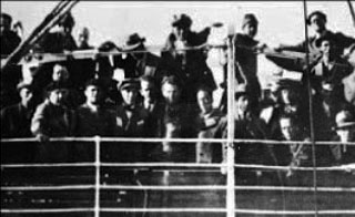 25 Οκτωβρίου 1935. Στο πλοίο που τον μετέφερε, μαζί με άλλους εκτοπισμένους, στον Αϊ-Στράτη (διακρίνονται στην κάτω σειρά: δεύτερος ο Δημ. Γληνός, τρίτος ο Βας. Δημητσάνος, τέταρτος ο Βάρναλης). ©Αρχείο Κ. Βάρναλη. Αναπαράγεται από την έκδοση Χρ. Ντουνιά, Λογοτεχνία και πολιτική. Τα περιοδικά της αριστεράς στο μεσοπόλεμο, Αθήνα, Καστανιώτης 1999.