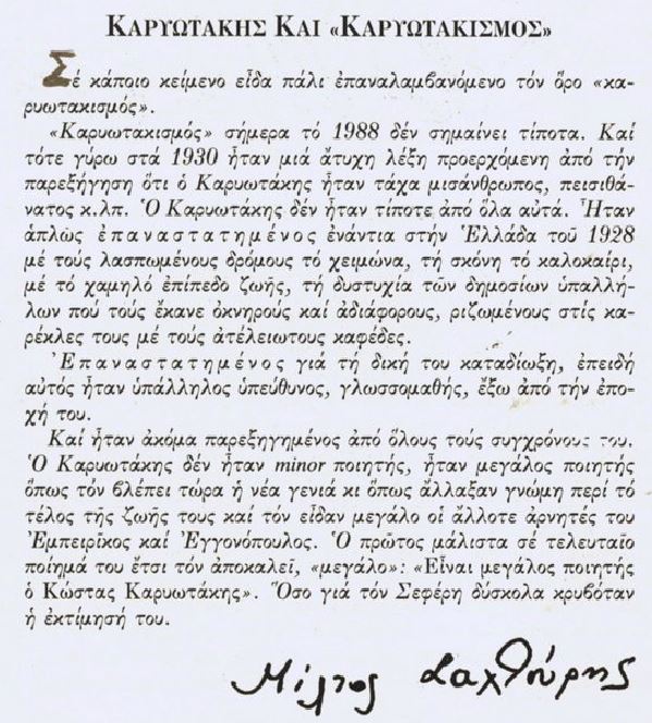 Σημείωμα του Σαχτούρη για τον καρυωτακισμό στο περιοδικό η λέξη 74 (1988).