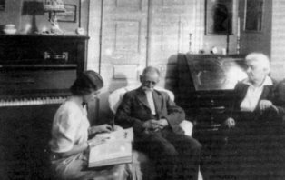 Σε μεγάλη ηλικία με τη γυναίκα του Μαρία και την κόρη του Ναυσικά στο σπίτι της οδού Ασκληπιού. [πηγή: Ίδρυμα Παλαμά]