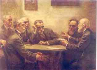 Γ. Ροϊλός, «Οι ποιητές» (1919). Στα δεξιά της σύνθεσης απεικονίζεται ο Α. Προβελέγγιος να διαβάζει κάποιο ποίημά του, ενώ από τα αριστερά προς τα δεξιά διακρίνονται οι Γ. Στρατήγης, Γ. Δροσίνης, I. Πολέμης, K. Παλαμάς και Γ. Σουρής [Πινακοθήκη Φιλολογικού Συλλόγου «Παρνασσός», πηγή: Φιλολογικός Σύλλογος Παρνασσός και Wikimedia Commons]