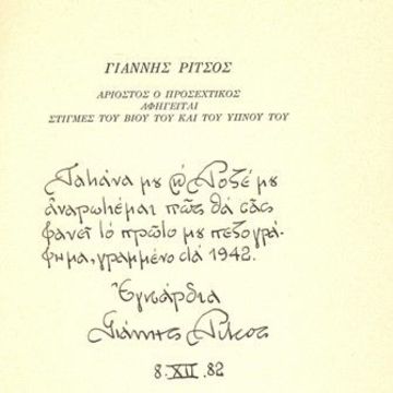 | 1986 | Σφραγισμένα μ’ ένα χαμόγελο, Λιγοστεύουν οι ερωτήσεις, Ο Αρίοστος αρνείται να γίνει Άγιος (έκδ.). Με αυτές τις αυτοτελείς εκδόσεις τα πεζά του Ρίτσου αριθμούν πια 9 τόμους, στους οποίους τίθεται ως υπέρτιτλος το Εικονοστάσιο Ανωνύμων Αγίων. | Σεισμός έντασης 6,2 Ρίχτερ στην Καλαμάτα. ~ Δ. Καψάλης, Ακόμα μια φορά. περ. ΠλανόδιονΤα Ποιήματα 1941-1971. | Δολοφονία Ούλοφ Πάλμε. Έκρηξη του πυρηνικού αντιδραστήρα στο Τσερνομπίλ. ~ Βραβείο Νομπέλ Λογοτ.: Wole Soyinka. |
