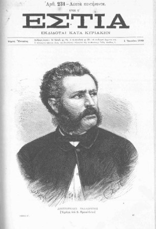| 1867 | Πατριωτική αγόρευση στη Βουλή ως εισηγητής νομοσχεδίου για τη στρατολογία, της κυβέρνησης Κουμουνδούρου. Αθανάσης Διάκος, Αστραπόγιαννος (α' έκδ). «Απόσπασμα εκ του "Τυφλού Χορμοβίτου"», στο Αττικόν Ημερολόγιον του δισέκτου έτους 1868. Γέννηση του γιού του Ανδρέα. | Σεισμός στη Κεφαλλονιά. Πτώση Κυβέρνησης Κουμουνδούρου. ~ περ. <Αττικόν Ημερολόγιον (-1896). | Karl Marx, Το Κεφάλαιο. Ίψεν, Πέερ Γκυντ. Λ. Τολστόι, Πόλεμος και Ειρήνη. |