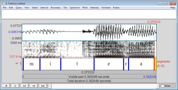 Στην παραπάνω εικόνα εμφανίζεται η κυματομορφή (επάνω λωρίδα) και το φασματογράφημα (κάτω λωρίδα) της λέξης μητέρα