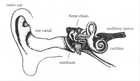 Στην παραπάνω εικόνα βλέπουμε το ακουστικό σύστημα του ανθρώπου. Το εξωτερικό αυτί συλλαμβάνει τον ήχο και τον οδηγεί στο εσωτερικό αυτί. Σε αυτή την πορεία, ο ήχος συντονίζει το τύμπανο. Οι παλμοί του τύμπανου μεταφέρονται σε μια αλυσίδα πολύ ελαφριών οστών, το ένα άκρο της οποίας ακουμπά στο τύμπανο και το άλλο άκρο της στο ακουστικό νεύρο. Με αυτό τον τρόπο κάθε δόνηση του τύμπανου ερεθίζει το ακουστικό νεύρο. Αυτός ο ερεθισμός μετατρέπεται σε ηλεκτροχημικό σήμα το οποίο στέλνεται στον εγκέφαλο.