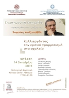 Οι κυρίες Τζακώστα Μαρίνα, Μόνιμη Επίκουρη Καθηγήτρια, Π.Τ.Π.Ε., Πανεπιστήμιο Κρήτης και Δρ. Καψάσκη Αγγελική, Σχολική Σύμβουλος Φιλολόγων Ρεθύμνου, διοργανώνουν επιστημονική ημερίδα στη μνήμη του Σωφρόνη Χατζησαββίδη με τίτλο "Καλλιεργώντας τον κριτικό γραμματισμό στο σχολείο" στο Ρέθυμνο (Πολιτιστικό Φοιτητικό Κέντρο "Ξενία"), στις 14 Οκτωβρίου 2015, 17:00-21:00.