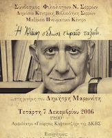 Ο Σύνδεσμος Φιλολόγων Ν. Σερρών (Σ.Φ.Σ), συνεχίζοντας τις δράσεις του για το σχολικό έτος 2016-2017, διοργανώνει σε συνεργασία με τη Δημόσια Κεντρική Βιβλιοθήκη Σερρών και το Μαξίμειο Πνευματικό Κέντρο εκδήλωση αφιερωμένη στον μεγάλο Δάσκαλο Δημήτρη Μαρωνίτη, που έφυγε πρόσφατα από κοντά μας.