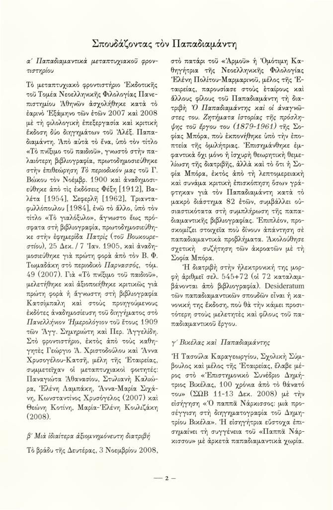 , «Σπουδάζοντας τον Παπαδιαμάντη. α΄ Παπαδιαμαντικά μεταπτυχιακού φροντιστηρίου», Δελτίο Εταιρείας Παπαδιαμαντικών Σπουδών, τχ. 4 (Δεκέμβριος 2008), σ. 2