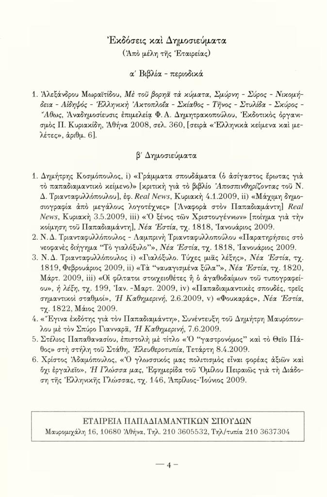 «Εκδόσεις και Δημοσιεύματα (Από μέλη της Εταιρείας)», Δελτίο Εταιρείας Παπαδιαμαντικών Σπουδών, τχ. 5 (Ιούνιος 2009), σ. 4