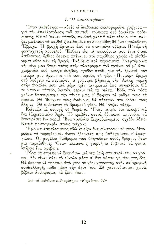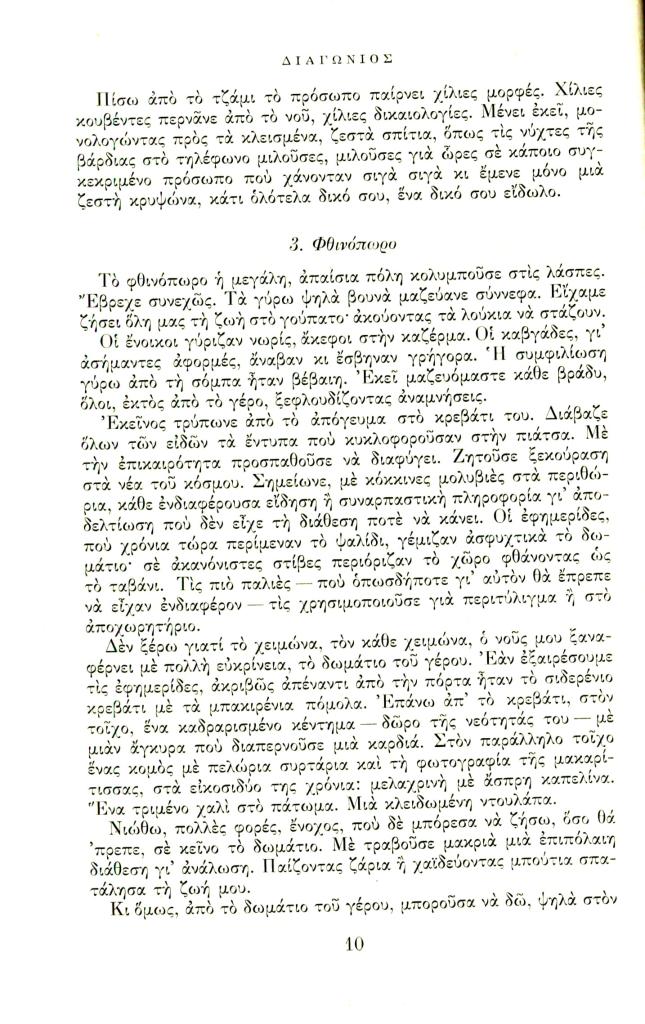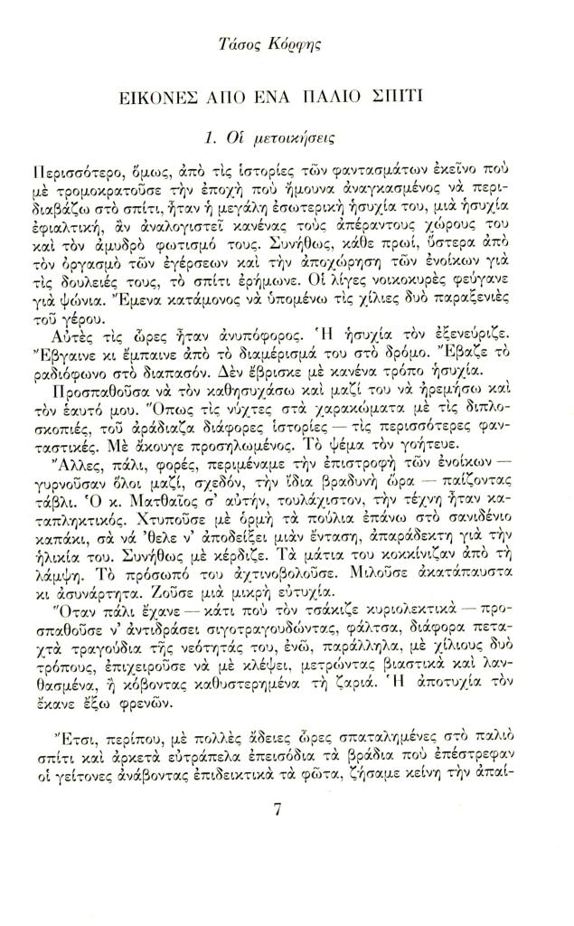 Κόρφης Τάσος, «Εικόνες από ένα παλιό σπίτι [απόσπασμα από το μυθιστόρημα Καραΐσκου 54]», Διαγώνιος, τχ. 17 (Ιανουάριος-Μάρτιος 1969), σ. 7-12
