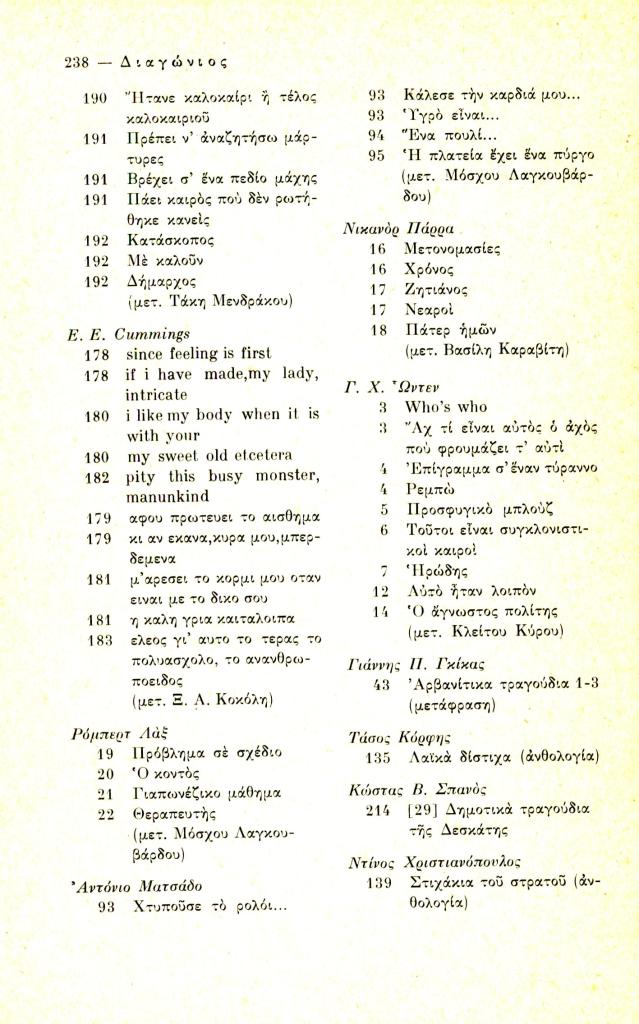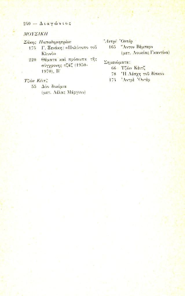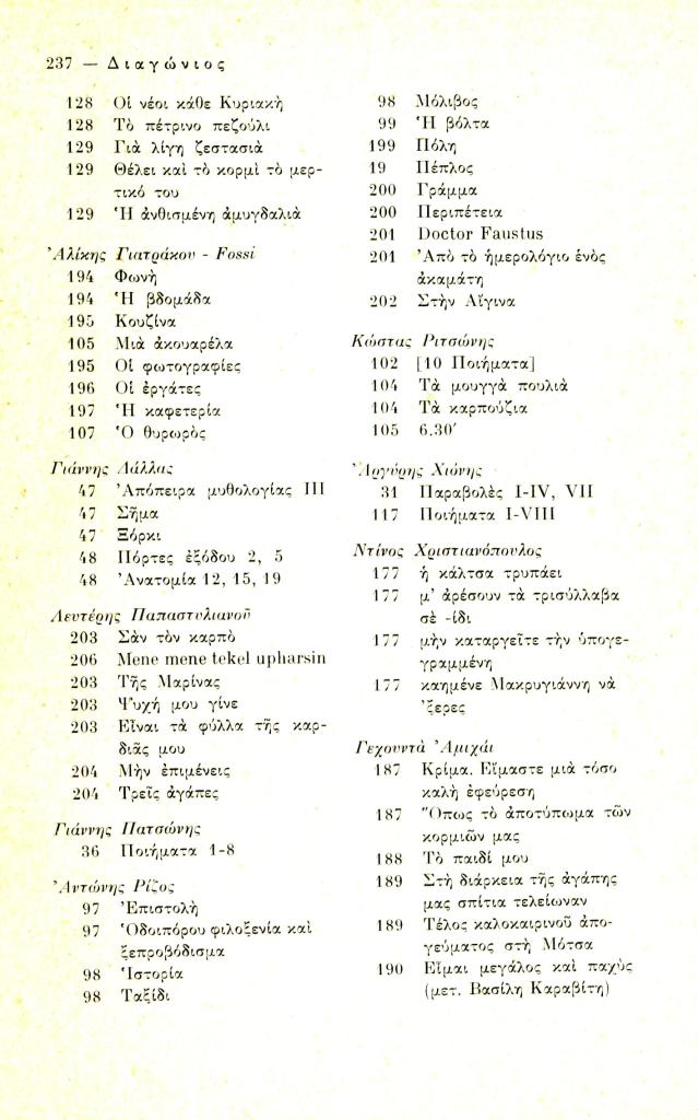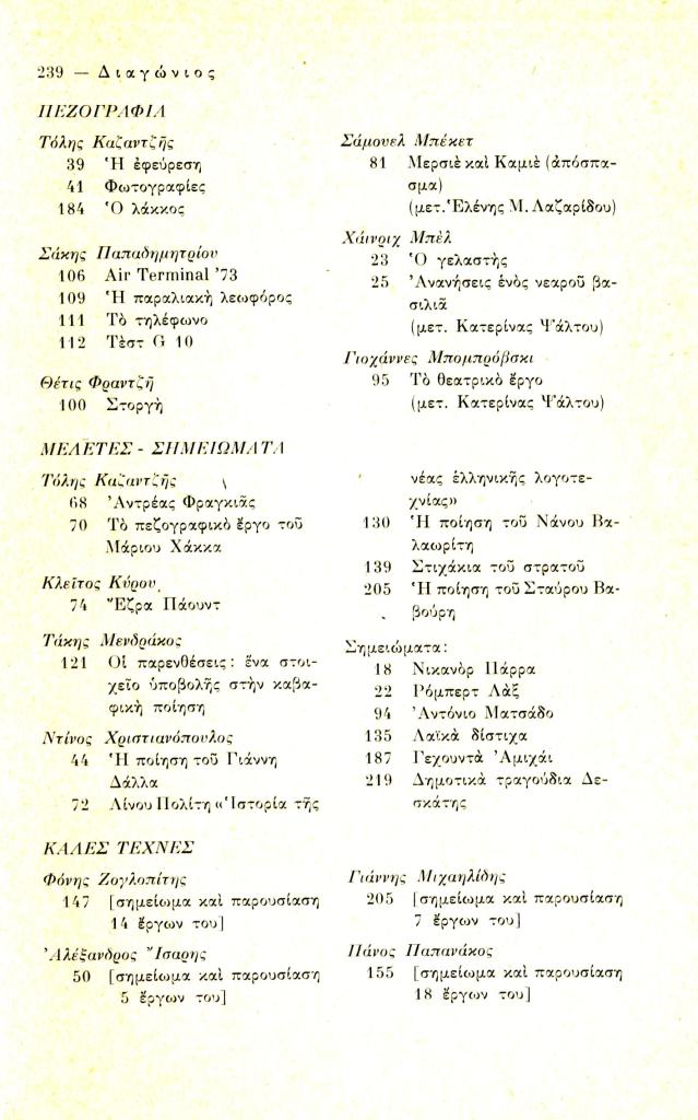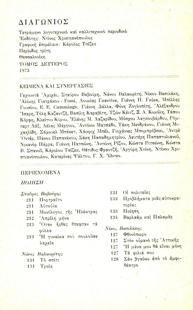 «Τόμος δεύτερος 1973-Κείμενα και συνεργασίες-Περιεχόμενα», Διαγώνιος, τχ. 6 (Σεπτέμβριος-Δεκέμβριος 1973), σ. 236-240