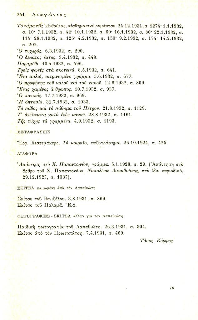 Κόρφης Τάσος, «Δημοσιεύματα Ν. Λαπαθιώτη στο Μπουκέτο (1924-1932)», Διαγώνιος, τχ. 9 (Σεπτέμβριος-Δεκέμβριος 1974), σ. 238-241