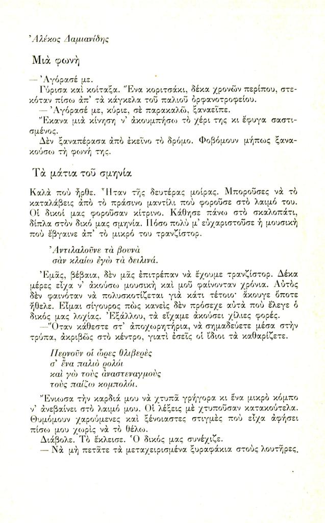 Δαμιανίδης Αλέκος, «Μια φωνή», Διαγώνιος, τχ. 10 (Ιανουάριος-Απρίλιος 1975), σ. 62
