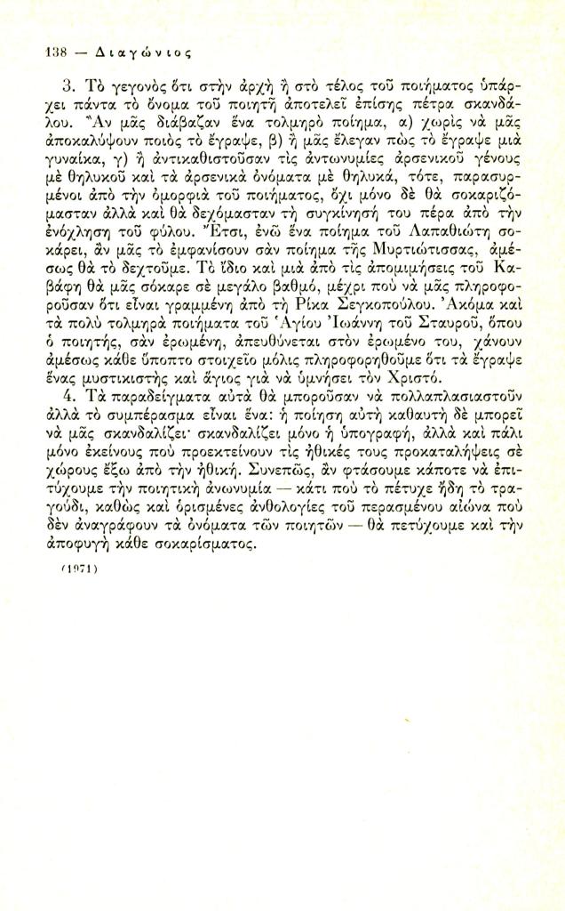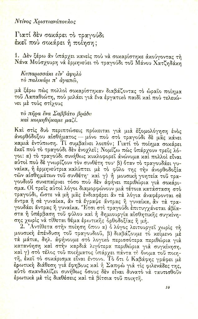 Χριστιανόπουλος Ντίνος, «Γιατί δεν σοκάρει το τραγούδι εκεί που σοκάρει η ποίηση;», Διαγώνιος, τχ. 11 (Μάιος-Αύγουστος 1975), σ. 137-138