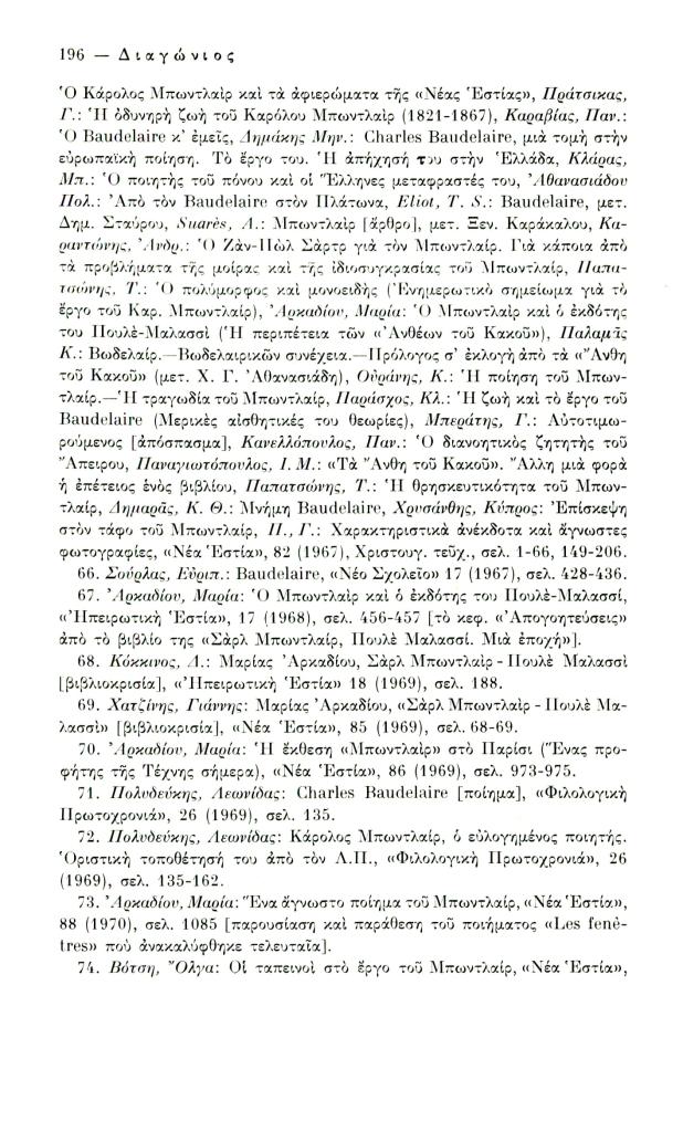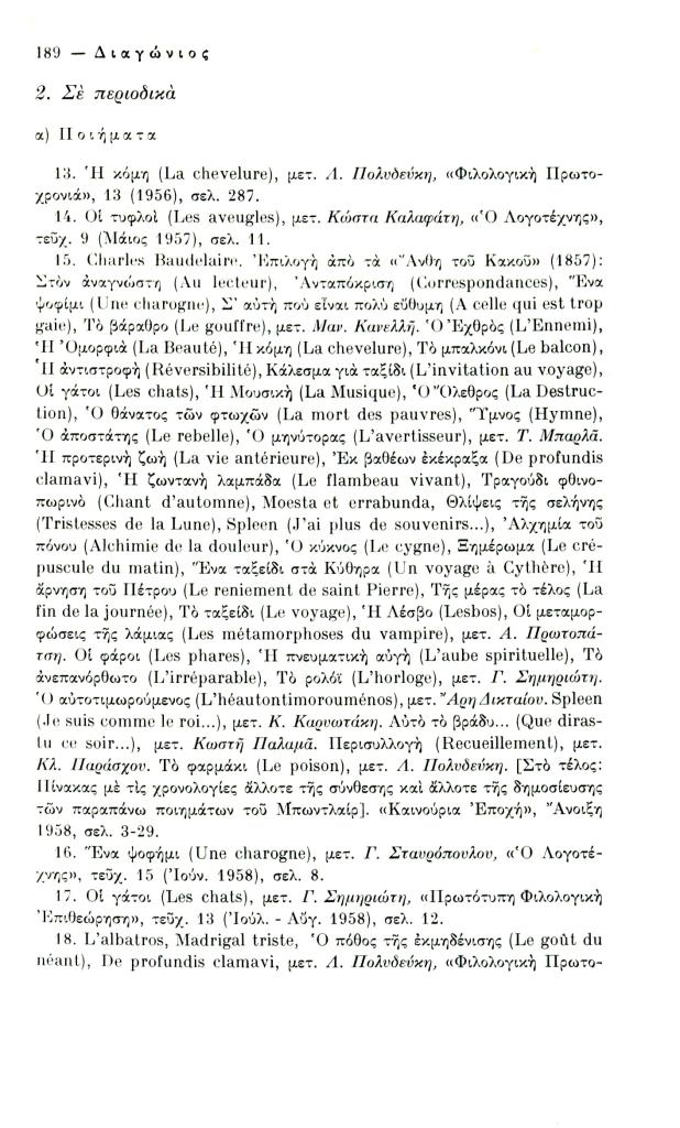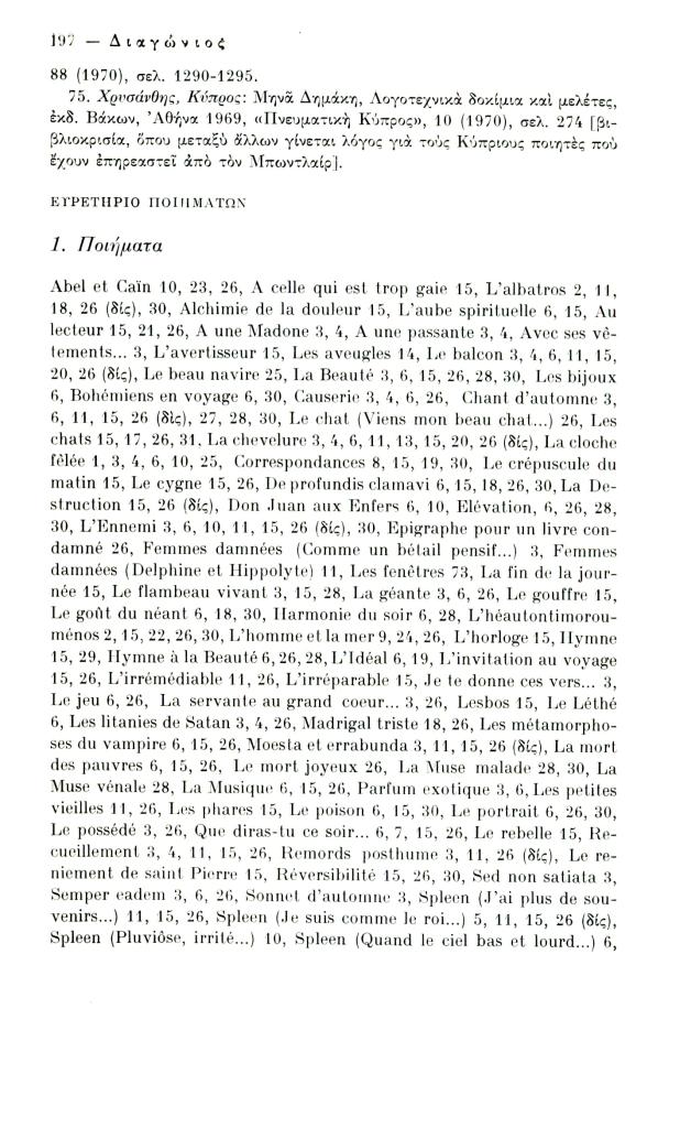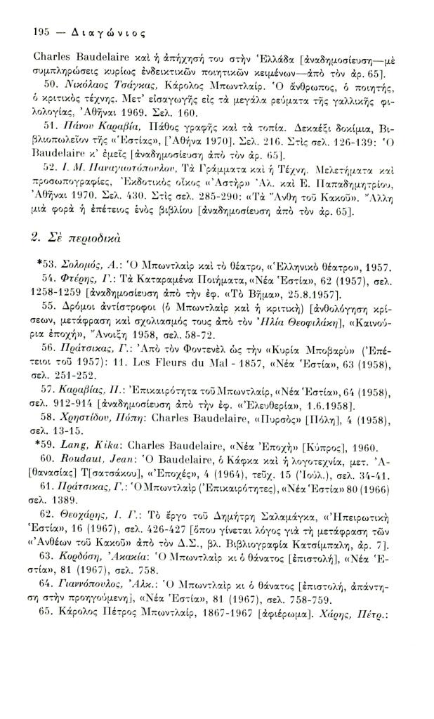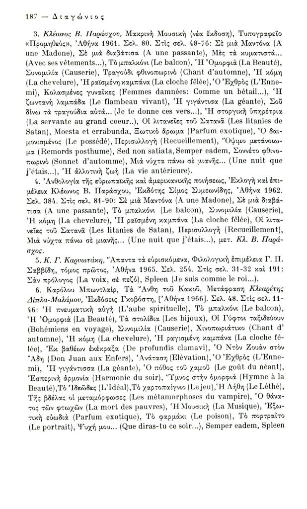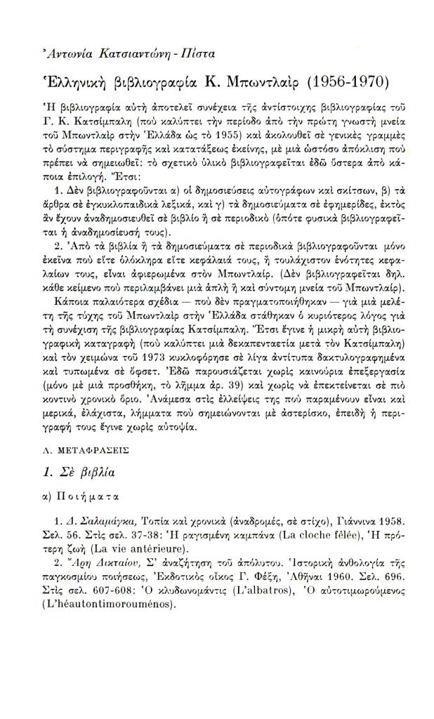 Κατσιαντώνη-Πίστα Αντωνία, «Ελληνική βιβλιογραφία Κ. Μπωντλαίρ (1956-1970)», Διαγώνιος, τχ. 14 (Μάιος-Αύγουστος 1976), σ. 186-198