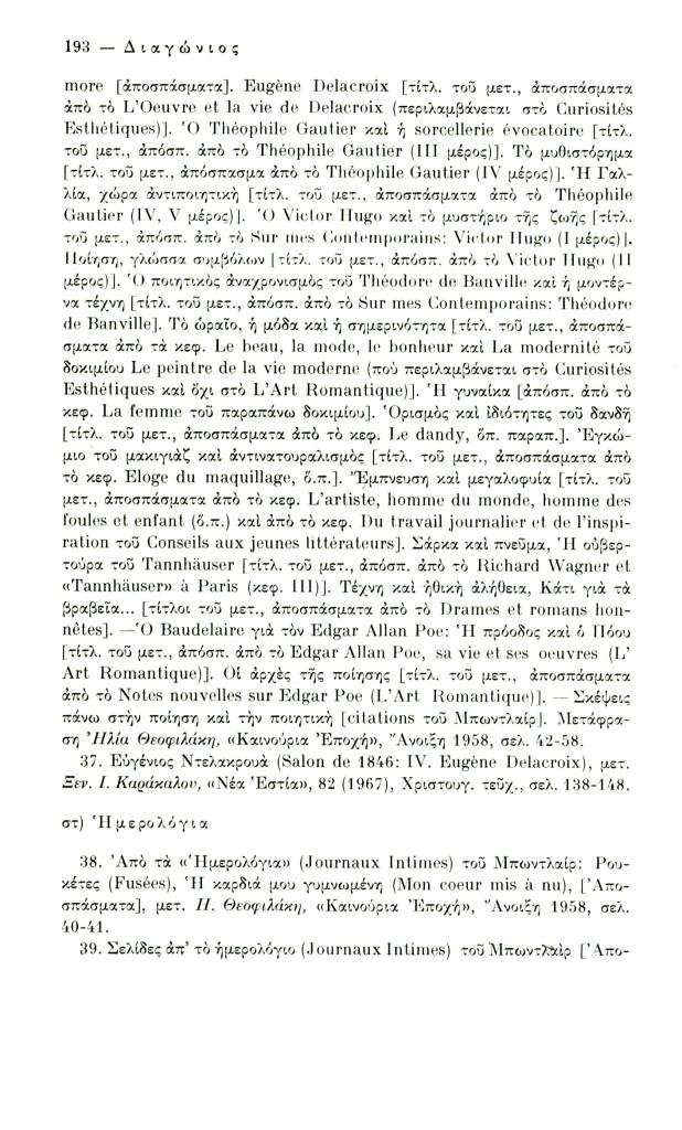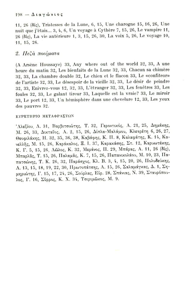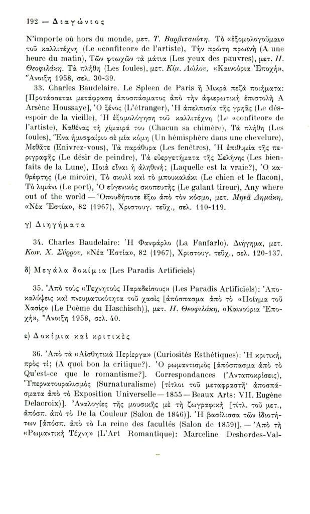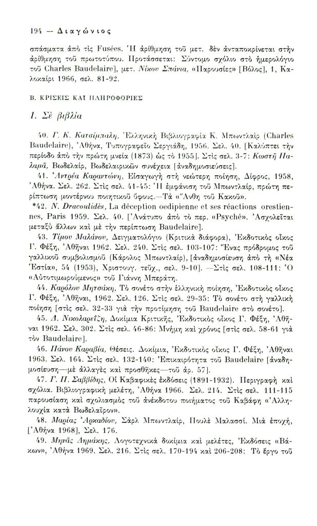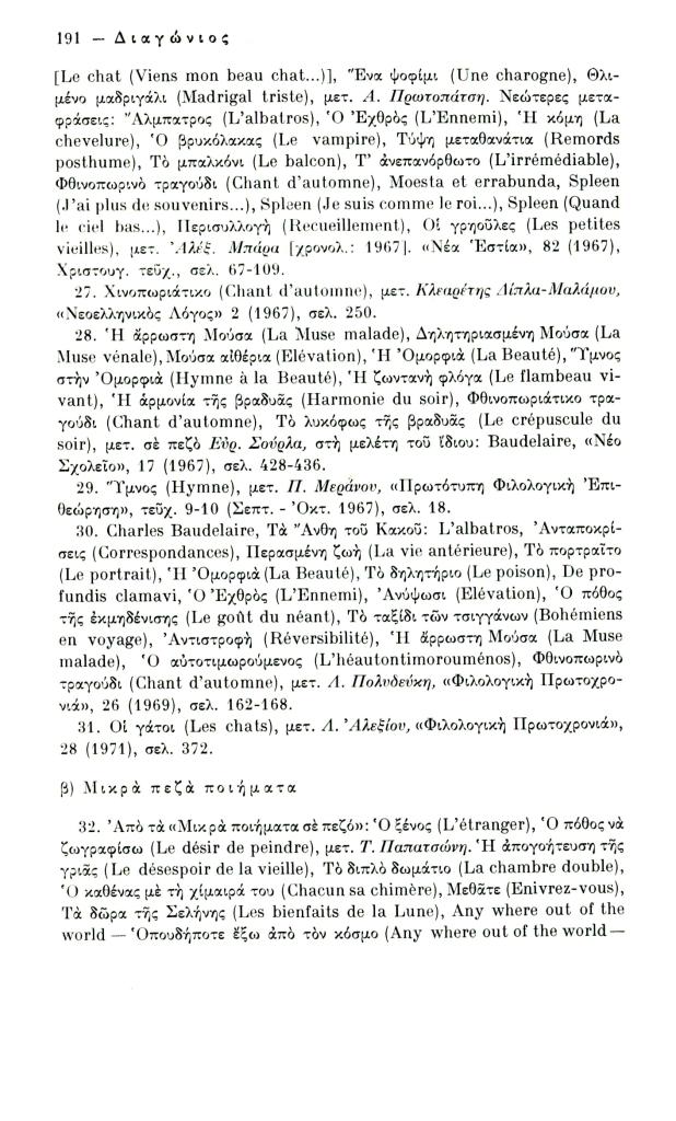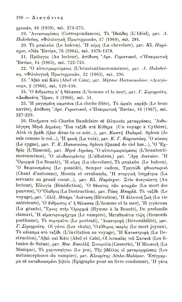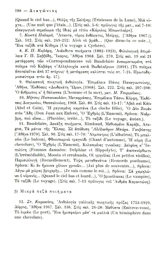 Κατσιαντώνη-Πίστα Αντωνία, «Ελληνική βιβλιογραφία Κ. Μπωντλαίρ (1956-1970)», Διαγώνιος, τχ. 14 (Μάιος-Αύγουστος 1976), σ. 186-198