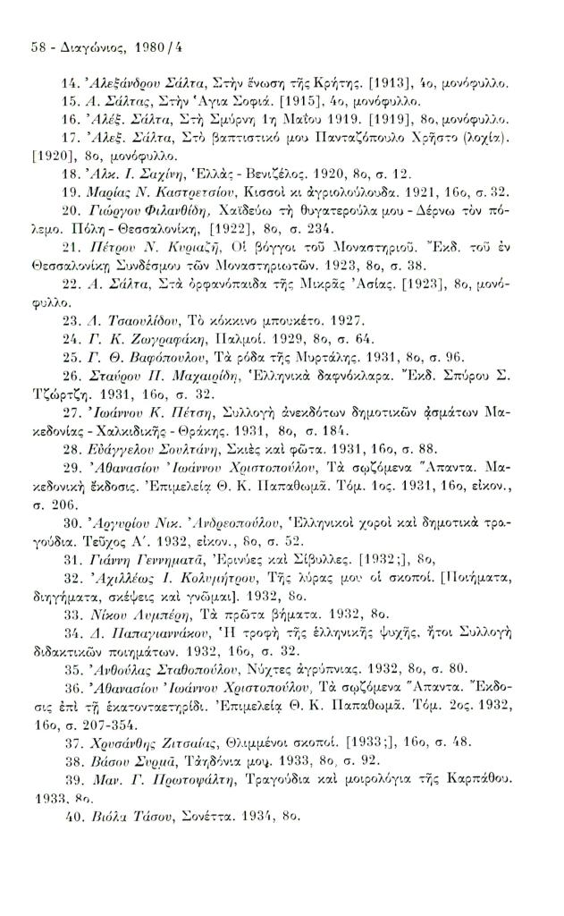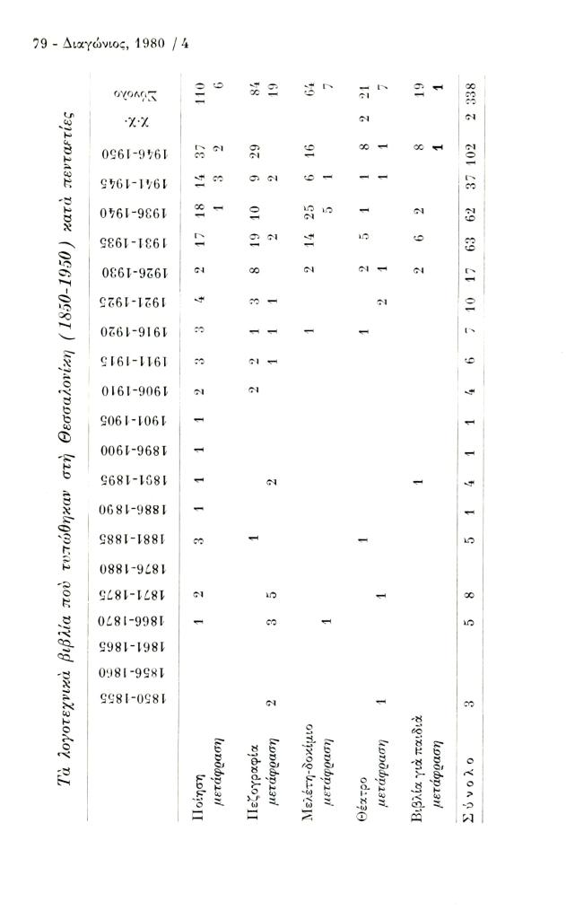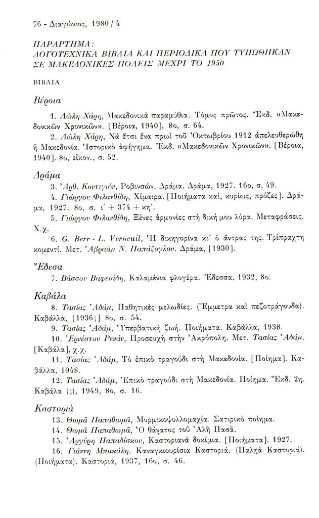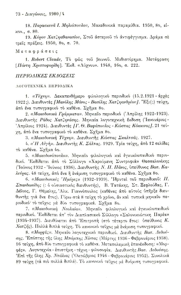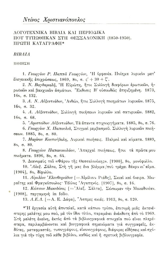 , «Λογοτεχνικά βιβλία και περιοδικά που τυπώθηκαν στη Θεσσαλονίκη (1850-1950). Πρώτη καταγραφή», Διαγώνιος, τχ. 4 (Ιανουάριος-Απρίλιος 1980), σ. 57-79