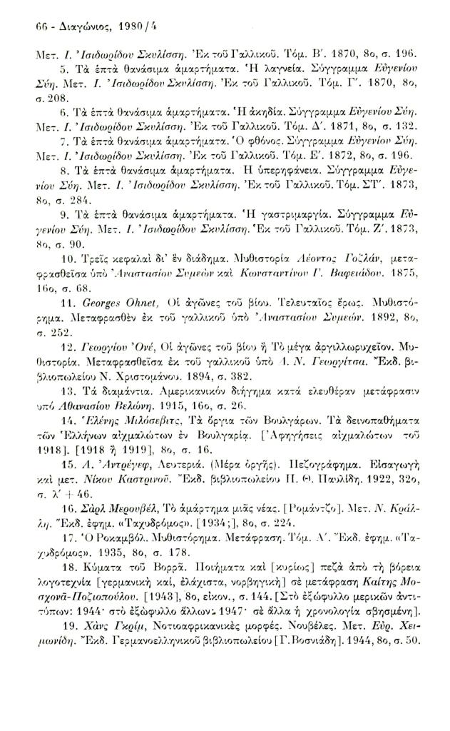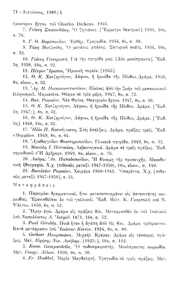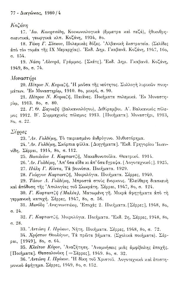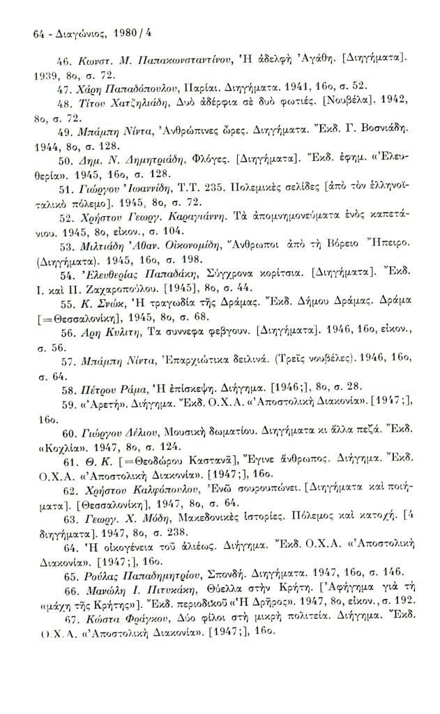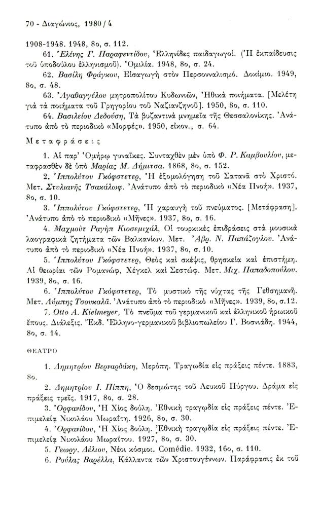 , «Λογοτεχνικά βιβλία και περιοδικά που τυπώθηκαν στη Θεσσαλονίκη (1850-1950). Πρώτη καταγραφή», Διαγώνιος, τχ. 4 (Ιανουάριος-Απρίλιος 1980), σ. 57-79