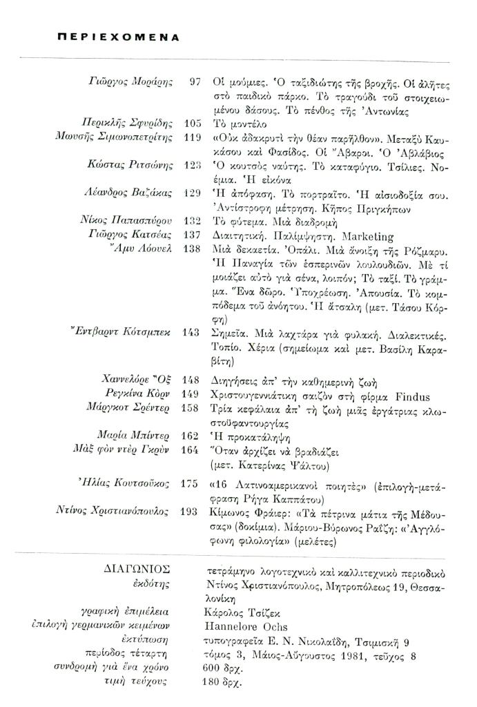 «Περιεχόμενα», Διαγώνιος, τχ. 8 (Μάιος-Αύγουστος 1981), σ. (εσώφυλλο)