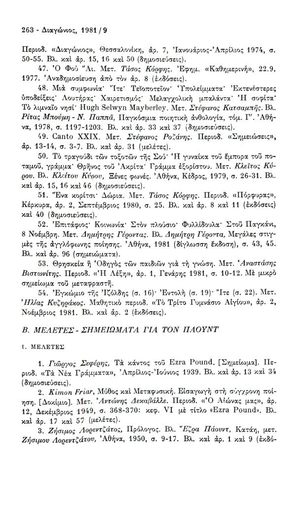 , «Ελληνική βιβλιογραφία Έζρα Πάουντ (1935-1982)»,