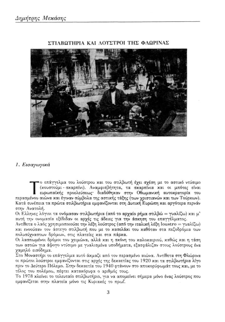 Μεκάσης Δημήτρης, «Στιλβωτήρια και λούστροι της Φλώρινας», Εταιρία, τχ. 8-9 (Δεκέμβριος 1991), σ. 3-7