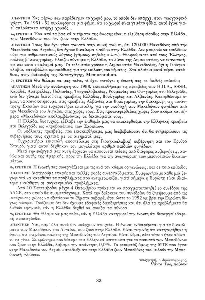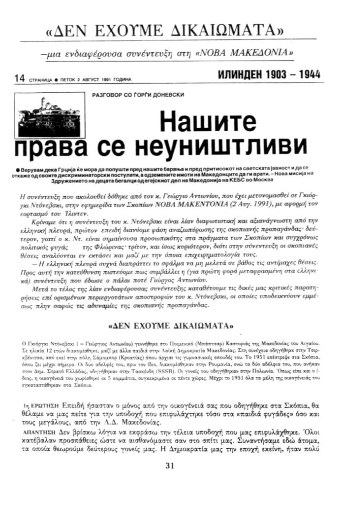 , «Δεν έχουμε δικαιώματα-μια ενδιαφέρουσα συνέντευξη στη Νόβα Μακεδονία», Εταιρία, τχ. 8-9 (Δεκέμβριος 1991), σ. 31-33