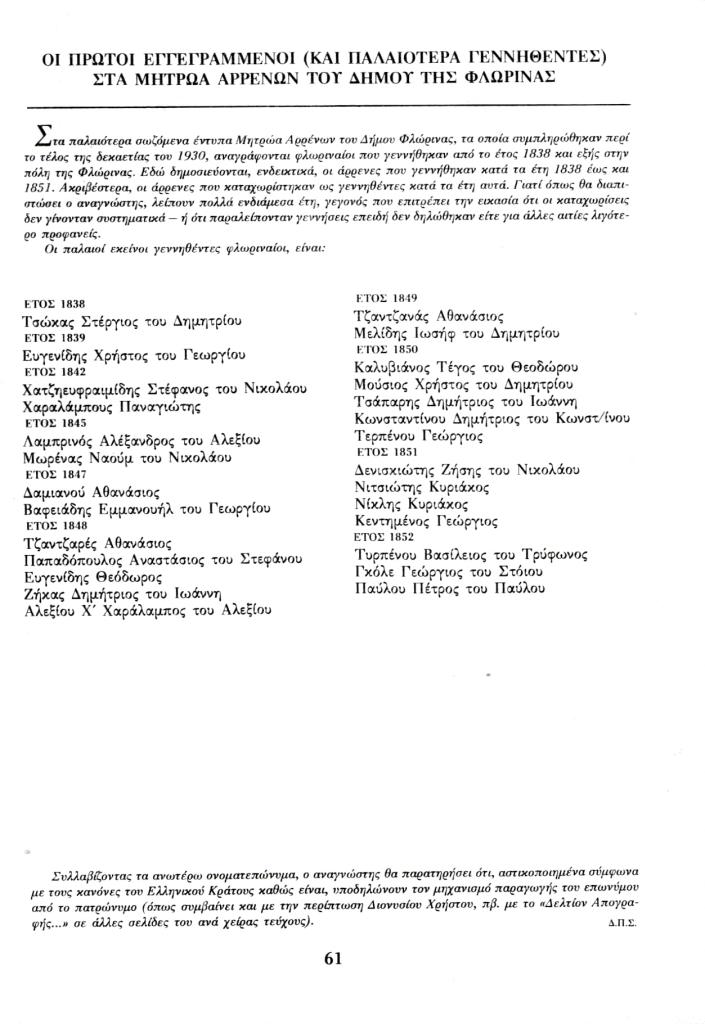 «Οι πρώτοι εγγεγγραμμένοι (και παλαιότερα γεννηθέντες) στα μητρώα αρρένων του Δήμου της Φλώρινας», Εταιρία, τχ. 11 (Οκτώβριος 1992), σ. 61