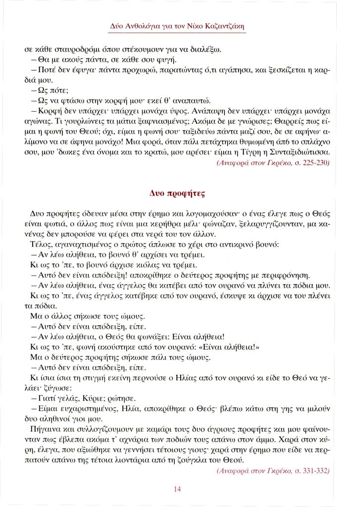 , «Δύο ανθολόγια για τον Νίκο Καζαντζάκη. Πρώτο ανθολόγιο: Είπε και έγραψε ο Καζαντζάκης. Δυο προφήτες», Φιλόλογος, τχ. 131 (Ιανουάριος-Φεβρουάριος-Μάρτιος 2008), σ. 14