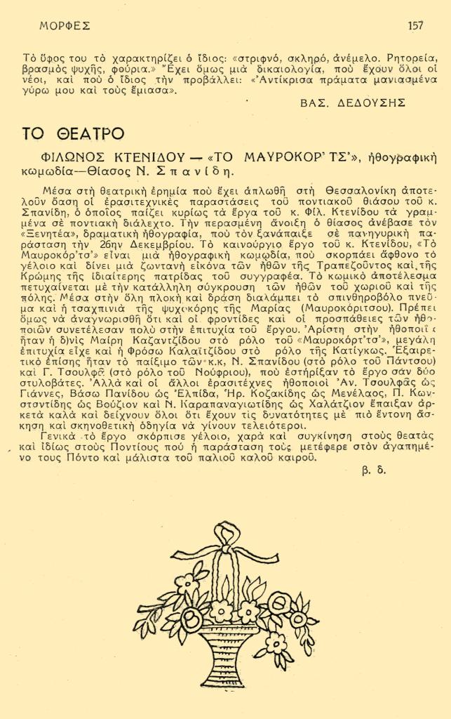 , «Το θέατρο. Φίλωνος Κτενίδου, Το μαυροκόρ'τς', ηθογραφική κωμωδία. Θίασος Ν. Σπανίδη», Μορφές, τχ. 4 (Χριστούγεννα 1946-Ιανουάριος 1947 1947), σ. 157