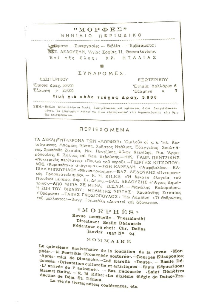 «Sommaire», Μορφές, τχ. 64 (Ιανουάριος 1952), σ. (εσώφυλλο)