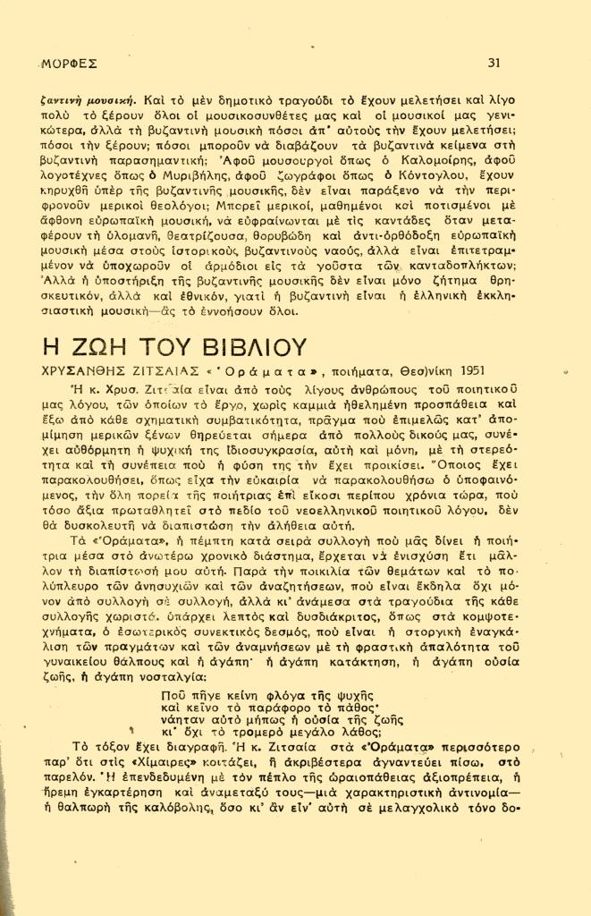 , «Η ζωή του βιβλίου. Χρυσάνθης Ζιτσαίας, Οράματα, ποιήματα, Θεσ)νίκη 1951», Μορφές, τχ. 64 (Ιανουάριος 1952), σ. 31-32