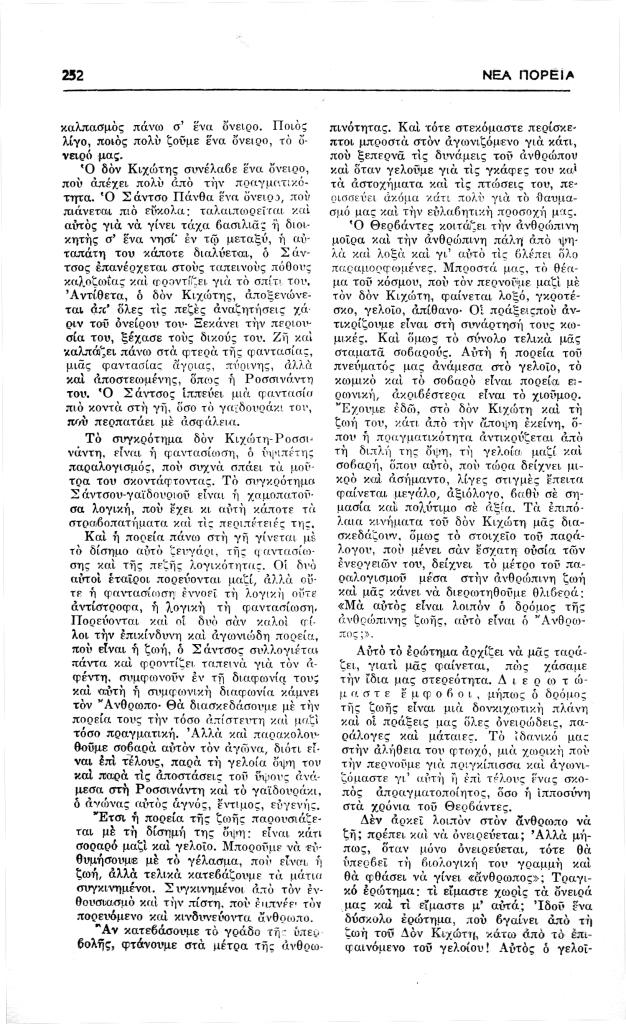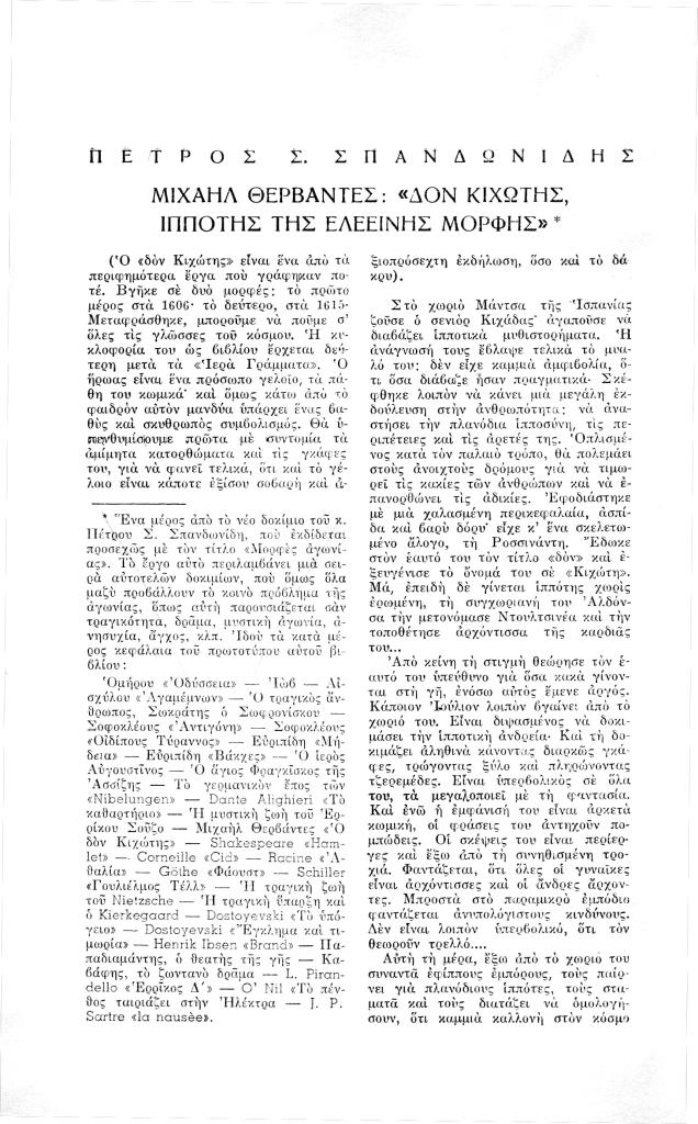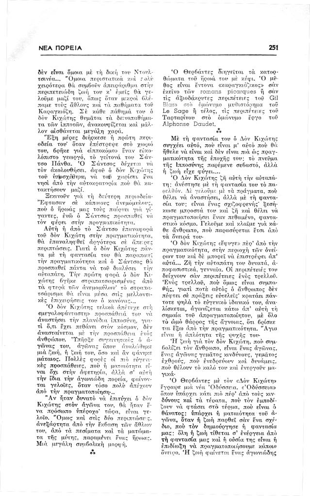 , «Μιχαήλ Θερβάντες: Δον Κιχώτης, ιππότης της ελεεινής μορφής», Νέα Πορεία, τόμ. 3, τχ. 31 (Σεπτέμβριος 1957), σ. 250-253