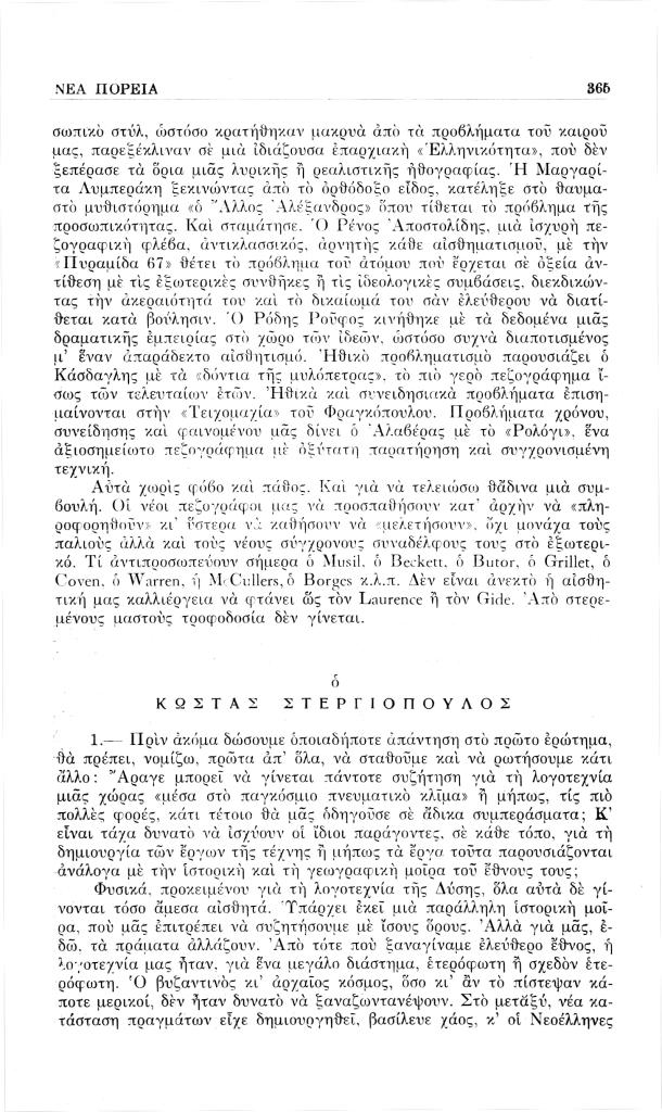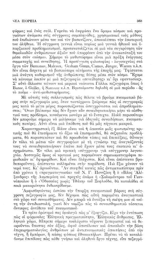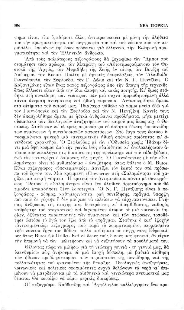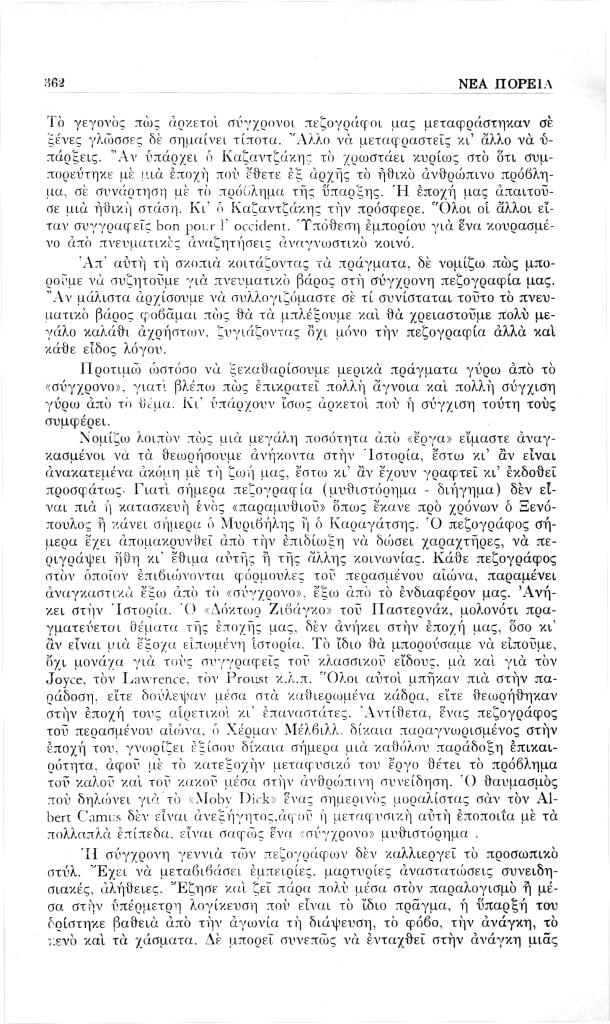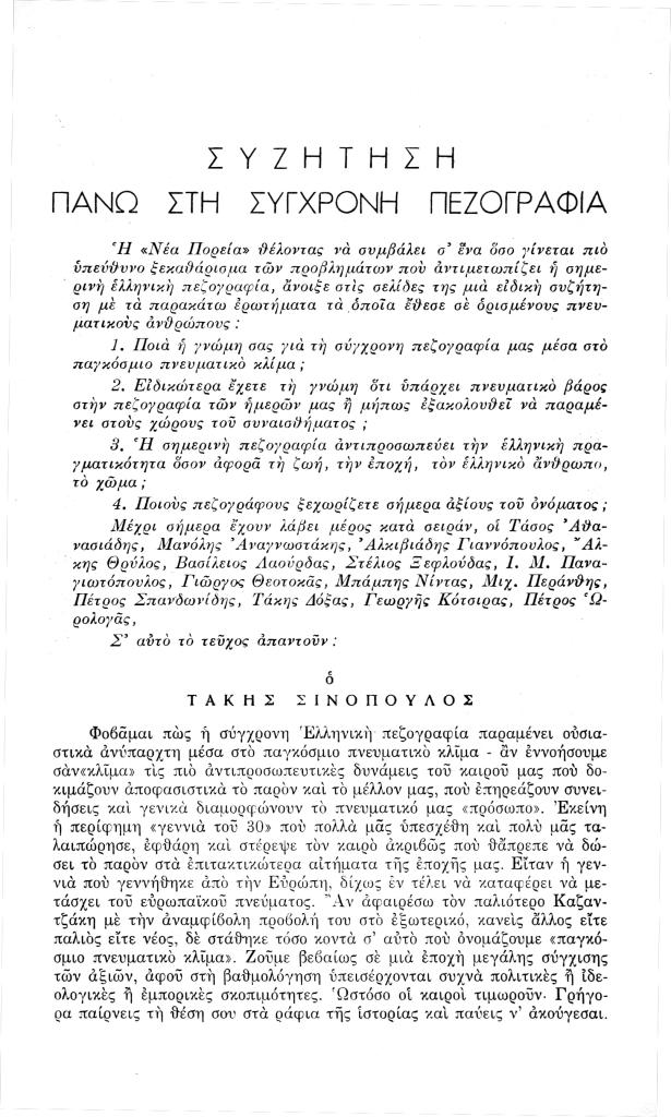 Σινόπουλος Τάκης, «Συζήτηση πάνω στη σύγχρονη πεζογραφία», Νέα Πορεία, τόμ. 4, τχ. 45-46 (Νοέμβριος-Δεκέμβριος 1958), σ. 361-365