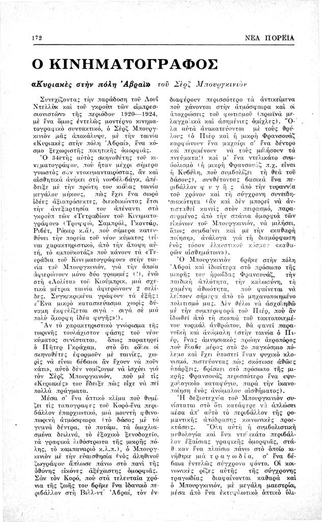 , «Ο κινηματογράφος. Κυριακές στην πόλη Αβραί, του Σερζ Μπουργκινιόν», Νέα Πορεία, τόμ. 9, τχ. 99-100 (Μάιος-Ιούνιος 1963), σ. 172-173
