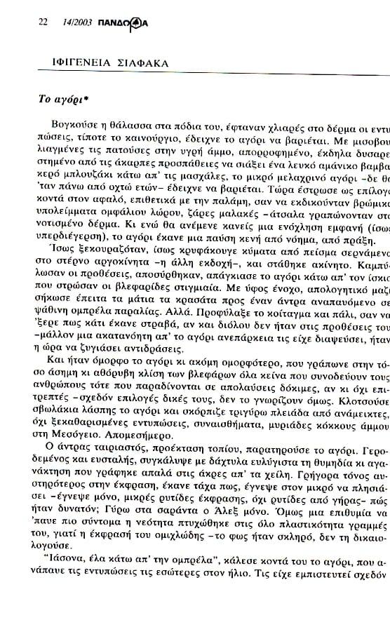 Σιαφάκα Ιφιγένεια, «Το αγόρι [απόσπασμα]», Πανδώρα, τχ. 14 (Νοέμβριος 2003-Μάιος 2004 2004), σ. 22-23
