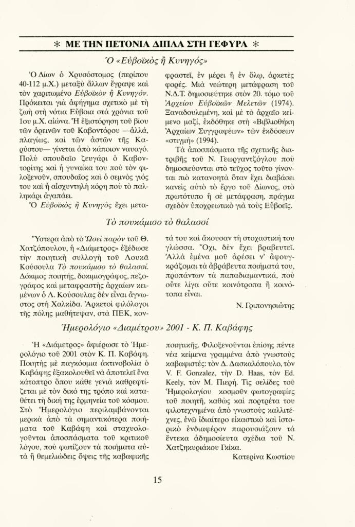 , «Με την πετονιά δίπλα στη γέφυρα. Ημερολόγιο Διαμέτρου 2001 – Κ.Π. Καβάφης», Τα Νεφούρια, τχ. 5 (Πρωτοχρονιά 2001), σ. 15