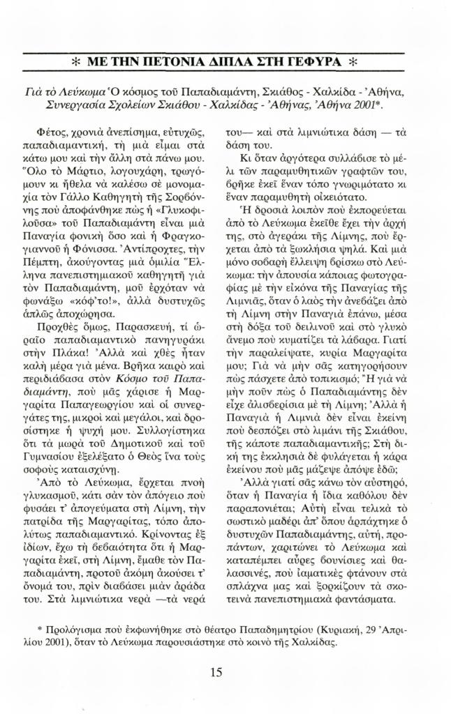 , «Με την πετονιά δίπλα στη γέφυρα. Για το Λεύκωμα Ο κόσμος του Παπαδιαμάντη, Σκιάθος-Χαλκίδα-Αθήνα, Συνεργασία Σχολείων Σκιάθου-Χαλκίδας-Αθήνας, Αθήνα 2001», Τα Νεφούρια, τχ. 6 (Ιούλιος 2001), σ. 15