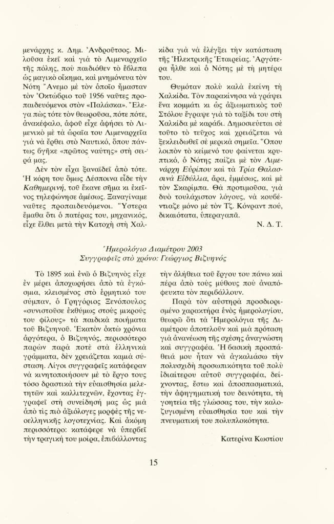 Κωστίου Κατερίνα, «Με την πετονιά δίπλα στη γέφυρα. Ημερολόγιο Διαμέτρου 2003. Συγγραφείς στο χρόνο: Γεώργιος Βιζυηνός», Τα Νεφούρια, τχ. 9 (Πρωτοχρονιά 2003), σ. 15