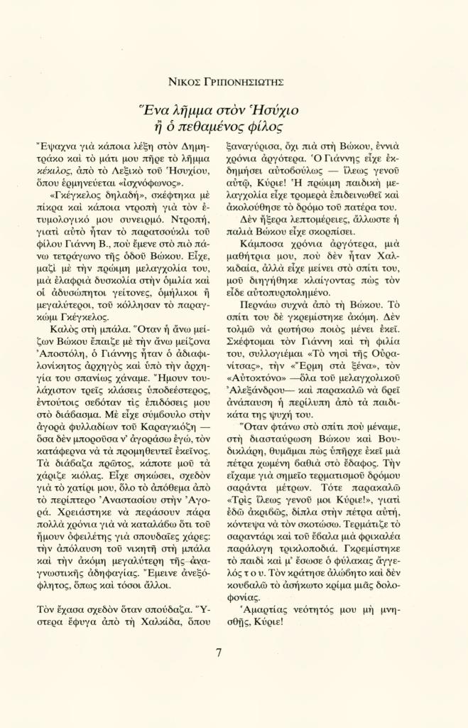 Τριανταφυλλόπουλος Νίκος Δ., «Ένα λήμμα στον Ησύχιο ή ο πεθαμένος φίλος», Τα Νεφούρια, τχ. 11 (Πρωτοχρονιά 2004), σ. 7