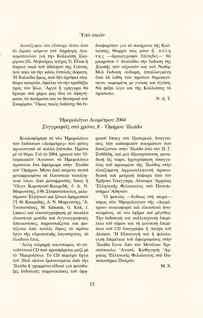 «Με την πετονιά δίπλα στη γέφυρα. Ημερολόγιο Διαμέτρου 2004. Συγγραφείς στο χρόνο, 8 – Ομήρου Ιλιάδα», Τα Νεφούρια, τχ. 11 (Πρωτοχρονιά 2004), σ. 15
