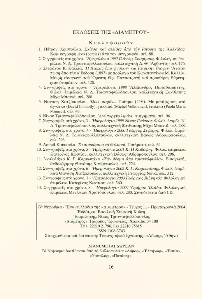 «Εκδόσεις της Διαμέτρου», Τα Νεφούρια, τχ. 11 (Πρωτοχρονιά 2004), σ. 16