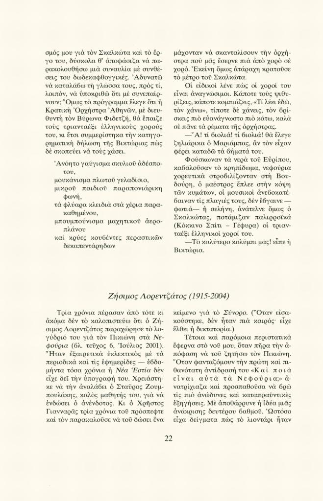 , «Με την πετονιά δίπλα στη γέφυρα. Ζήσιμος Λορεντζάτος (1915-2004)», Τα Νεφούρια, τχ. 12 (Πρωτοχρονιά 2005), σ. 22-23