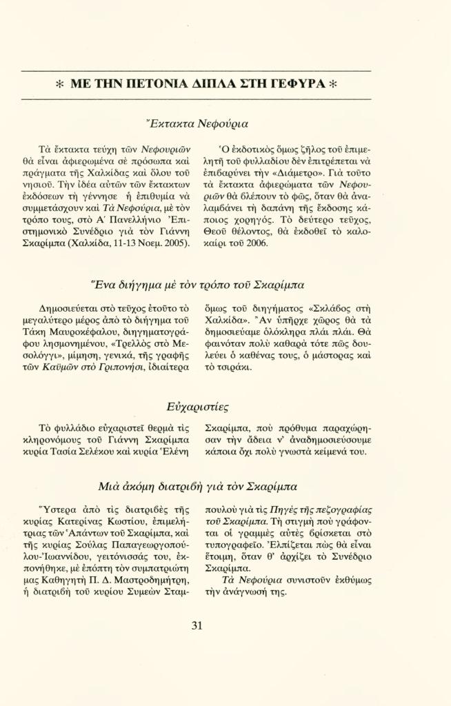 , «Με την πετονιά δίπλα στη γέφυρα. Ένα διήγημα με τον τρόπο του Σκαρίμπα», Τα Νεφούρια, τχ. 13 (Νοέμβριος 2005), σ. 31