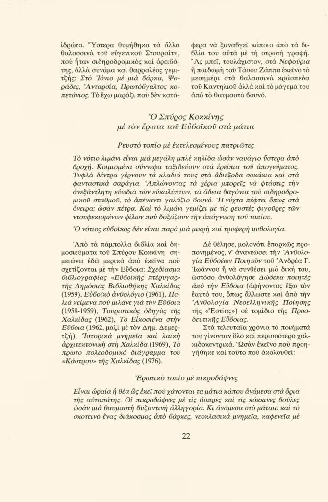 , «Με την πετονιά δίπλα στη γέφυρα. Ο Σπύρος Κοκκίνης με τον έρωτα του Ευβοϊκού στα μάτια», Τα Νεφούρια, τχ. 14 (Πρωτοχρονιά 2006), σ. 22-23