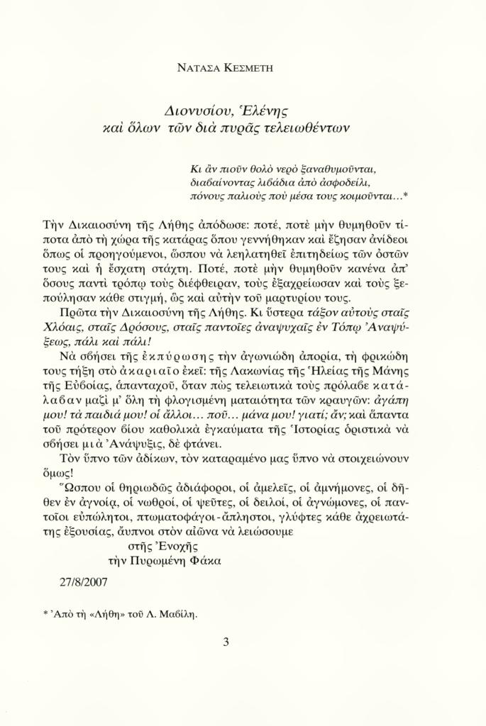 , «Διονυσίου, Ελένης και όλων των διά πυρός τελειωθέντων»,