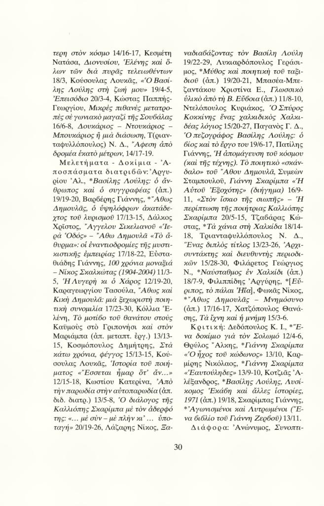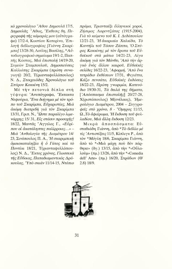 «Περιεχόμενα τευχών 11-20 (2004-2008)», Τα Νεφούρια, τχ. 20 (Φθινόπωρο 2008), σ. 29-31