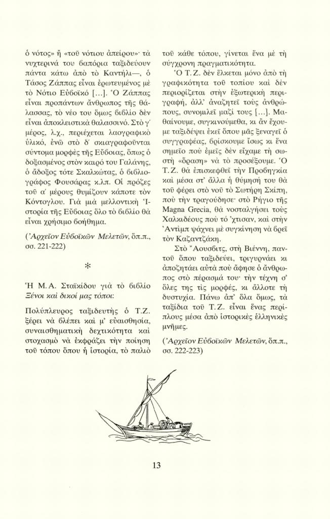 , «Η κριτική για τον Τάσο Ζάππα. Ο Ν.Δ. Τριανταφυλλόπουλος για τα Ευβοϊκά Β΄ [Απόσπασμα]», Τα Νεφούρια, τχ. 25 (Φθινόπωρο 2010), σ. 12-13